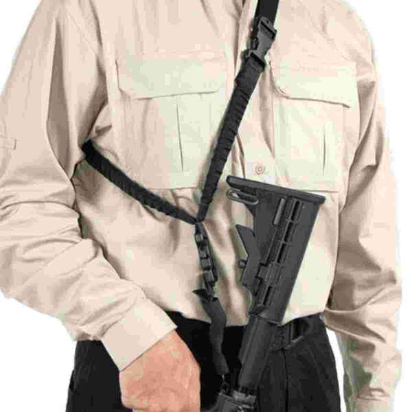 Heavy-duty tri-glide buckle metal oval ring and dual 300 lb. test side-release buckles for quick sling detachment firearm attachment and weapon removal