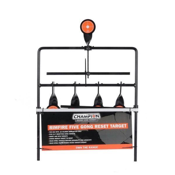Work on your aim with the Champion Rimfire Five Gong Resetting Target. The target is designed for use with .22 rimfire ammunition and it resets after all 5 targets have been hit for use convenience. The steel construction affords durability.