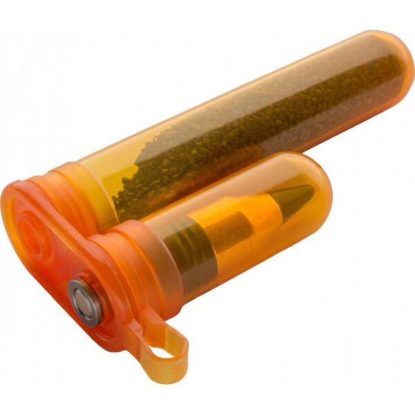 Clear Florescent orange design to hold bullet and powder in separate compartments. Lid accommodates either a 209 or Variflame adapter.