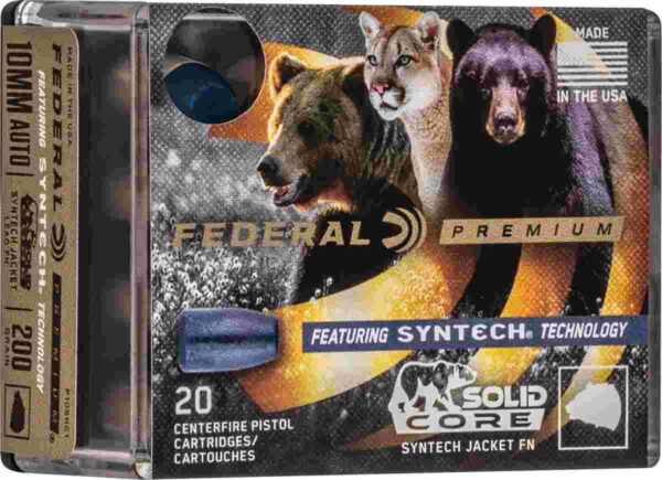 Take down anything from hogs to bears with Federal Premium Solid Core. The all-new line of handgun loads hits game harder with a tough flat-nose lead bullet that holds together while blowing through bone providing high weight retention and deep penetration. Syntech polymer jacket technology reduces the friction and leading that plague hard cast bullets. Available in cartridges suited for both hunting and dangerous animal defense.