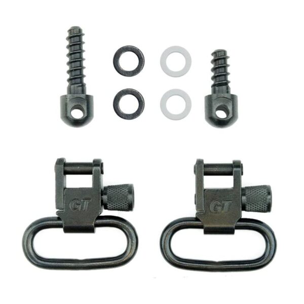 Set includes 1/2" wood screw fore end swivel stud 3/4" wood screw rear spacers and a pair of GT Locking Swivels.