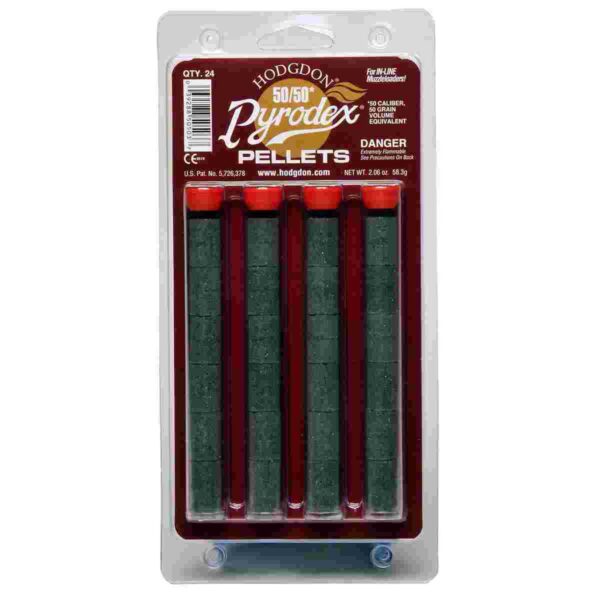 These Pyrodex Pellets from Hodgdon were specifically designed for use with .50-caliber inline rifles. You have the option to use one pellet or two pellets at a time depending on the application. For small game or light targets use one 50/50 pellet. For larger game use two 50/50 pellets to create a 100-gram equivalent.