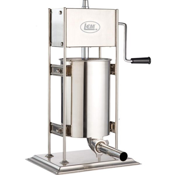 The "90-degree" handle on the Big Bite Dual-Gear Stuffer gives you greater leverage and makes cranking easier than ever. Designed exclusively for LEM these heavy-duty dual gear stuffers are the best you can buy. The huge drive gear notched piston rod and all-metal gears are built to deliver and withstand the pressure needed to stuff even small sausages. Four solid stainless steel bars create a sturdy frame that won't bend or bow under pressure. The unique two-speed design allows a high speed to raise the piston quickly for filling the cylinder and a low speed for stuffing casings. An air release valve in the piston ensures even pressure and better results and a heavy-duty rubber gasket seals the cylinder to prevent leaks. The stainless cylinder is removable for easy filling and cleaning. Mounting holes in the base. Includes four stainless steel stuffing tubes (5/8" 3/4" 1" and 1-1/2"). The 25 lb Dual Gear Stuffer is not recommended for snack sticks.