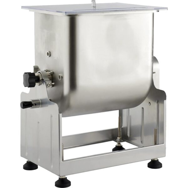 LEM's Big Bite Tilt Mixer utilizes three tilt positions for easy unloading filling and storage. The meat tub detaches for easy cleaning. The gearbox includes roller bearings and step gear providing powerful torque for paddles to thoroughly mix the meat. The meat tub has three locking positions: 90° for easy unloading 115° easy filling and 180° for storage. The feet adjust for height and swivel to adjust to uneven surfaces. A clear acrylic PMMa cover and crank handle are included. Grinder/Motor is NOT included.The 25 lb. mixer tub measures 10 3/4" L x 10" W x 12" H. This 25 lb. mixer works with our #8 Big Bite Meat Grinder or larger.