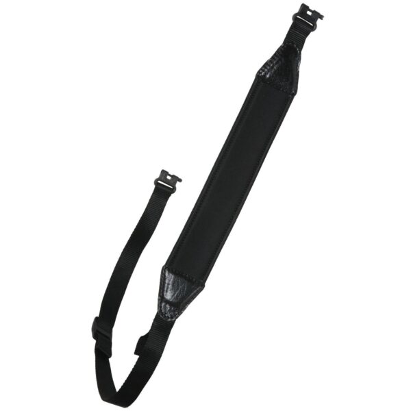 2 inch wide shoulder pad area made of 8mm closed cell neoprene with non-slip backing for carrying comfort that absorbs the weight of the firearm. MilSpec type webbing with Cape buffalo grain leather end tabs. . Integral Thumb-Loop allows for maximum control of the sling and firearm. Heavy Duty Tri-Glide with Slip Lock allows quick and secure sling length adjustment. Adapts to rifle or shotgun. 1 inch BRUTE Swivels install easily onto existing swivel bases. GUARANTEED FOREVER