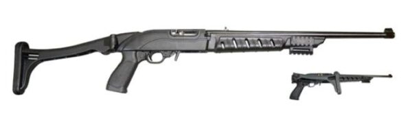 A lightweight folding stock for the Ruger 10/22 rifle / carbine. Pistol grip with storage compartment Picatinny tri-rail forend positive locking side folding stock with rubber recoil pad. Constructed of injection molded black polymer. Rifle shown NOT included.
