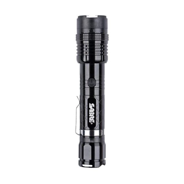 Strong pain-inducing stun gun for self-defense plus tactical flashlight design. Includes belt holster and clip. Features a safety switch to prevent accidental discharge.
