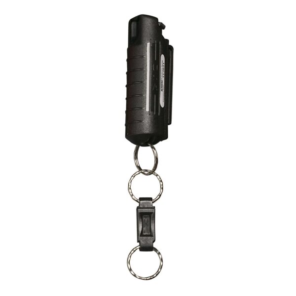 The Quick Release with detachable key chain allows immediate access to your defense spray when unlocking a door or driving an automobile. The most popular SABRE style the Quick Release is a powerful 0.54 oz container delivering a ballistic stream which reduces wind blow-back about 8-10 feet. Approximately 25 shots are contained in the compact canister.