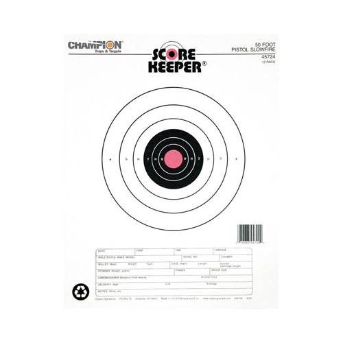 Champion Score Keeper Fluorescent Orange paper targets make it easy to see your shot placement and record ammunition data in one place. The bright orange fluorescent bullseye creates a contrast between the bullseye and the rest of the target and a “built-in” record-keeping section lets you track vital data to refine your loads and zero-in on tight groups. Available for rifles, pistols, and airguns.