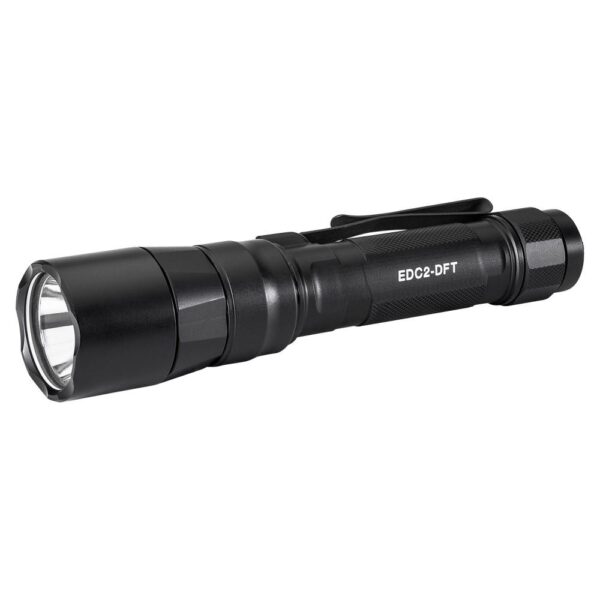 Turbocharge Your Low-Light Vision. SureFire’s Everyday Carry Series punches deep into darkness with the EDC2-DFT a Dual Fuel high-candela handheld flashlight that delivers impressive long-distance illumination in a remarkably compact form factor. With a blinding peak beam intensity of 100000 candela using the included SF18650B rechargeable lithium-ion battery or 90000 candela with two 123A batteries the EDC2-DFT delivers the farthest-reaching beam of any compact SureFire EDC handheld light. You'll see farther into the dark to positively identify a potential threat and the EDC2-DFT also provides ample spill light for situational awareness. In addition the EDC2-DFT offers more runtime by virtue of its more energy-dense power sources. Constructed of lightweight aerospace aluminum Mil-Spec hard-anodized and O-ring sealed to keep out the elements the body and tailcap are also knurled for a secure grip. A sturdy two-way clip offers the added flexibility of bezel-up or bevel-down carry. The EDC2-DFT delivers SureFire quality performance and dependability in an everyday carry flashlight that provides peace of mind by helping you see farther into the unknown.