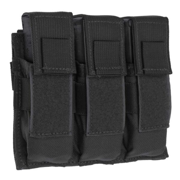 The heavy duty elastic retention strap and hook/loop holds your loaded magazines tight while the handy pull tabs ease deployment with or without gloves. Special reinforcements with double stitching and bar-tacks in high wear and stress points deliver exceptional performance.The Universal Triple Pistol fits popular pistol magazines either a double or single stack. It holds (3) Double or Single Stack Magazines.